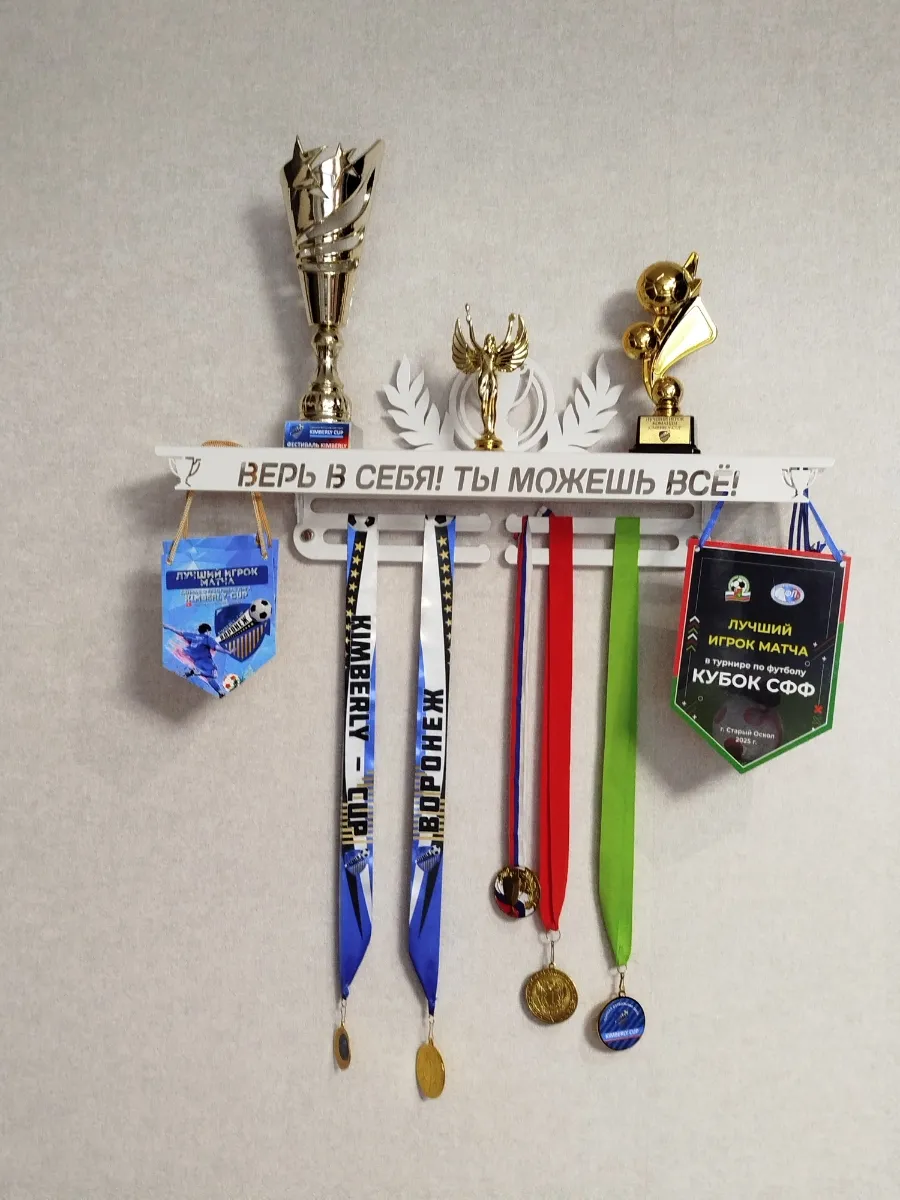 Медальница с полкой для кубков металлическая Оптима 2 "Верь в себя, ты можешь всё" - мотивирующая, универсальная (под любой вид спорта) медальница, позволяет разместить 50-60 медалей, а также кубки, статуэтки, вымпелы и магниты. Держатель для медалей и кубков изготовлена из стали и покрыта порошковой краской, что обеспечивает долговечность и презентабельный вид полки. Медальница размещается при помощи дистанционных держателей. Полка комплектуется фигуркой "Ника", которая закрепляется по центру полки. В кронштейнах слева и справа, а также в полке с обеих сторон наши конструкторы предусмотрели технологические прорези, позволяющие дополнительно разместить вымпела и бейджи, не занимая место на самой медальнице.