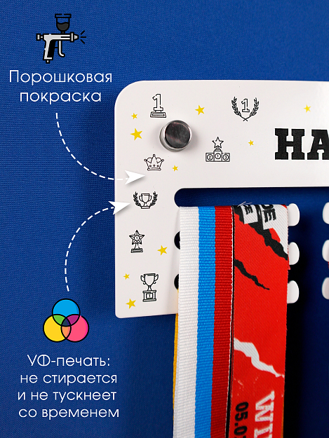 Эта небольшая, но очень крепкая и вместительная медальница порадует любого чемпиона! Изготовлена из стали толщиной 1,2 мм и выдерживает весомую нагрузку, недостижимую для спортивных медальниц из других материалов. Держатель для медалей имеет следующие размеры: ширина - 30,5 см, высота - 10 см. Вы сможете с легкостью разместить порядка 30-40 медалей на стандартных лентах.Покрытие держателя для медалей – порошковая окраска, это промышленный способ окраски, который позволяет создать равномерное, эстетичное и безопасное покрытие на металле по всей площади изделия. Цветная ультрафиолетовая печать – яркое, безопасное и стойкое к смыванию нанесение, которое будет радовать вас первозданными цветами долгие годы.В комплект входит монтажный набор: дюбеля, саморезы и фирменные дистанционные держатели, позволяющие создать отрыв от стены, для удобства размещения ваших медалей. Докупать ничего не придётся – всё уже продумано для вас! Поставляется медальница в крафтовой коробке, защищающей содержимое от повреждений при транспортировке.Данная модель подойдёт любому спортсмену с достаточным количеством трофеев в следующих видах спорта: футбол, хоккей, легкая атлетика марафон триатлон бег ходьба, тяжелая атлетика, пауэрлифтинг художественная и спортивная гимнастика бокс карате кикбоксинг баскетбол теннис волейбол ММА велоспорт, плавание стрельба.