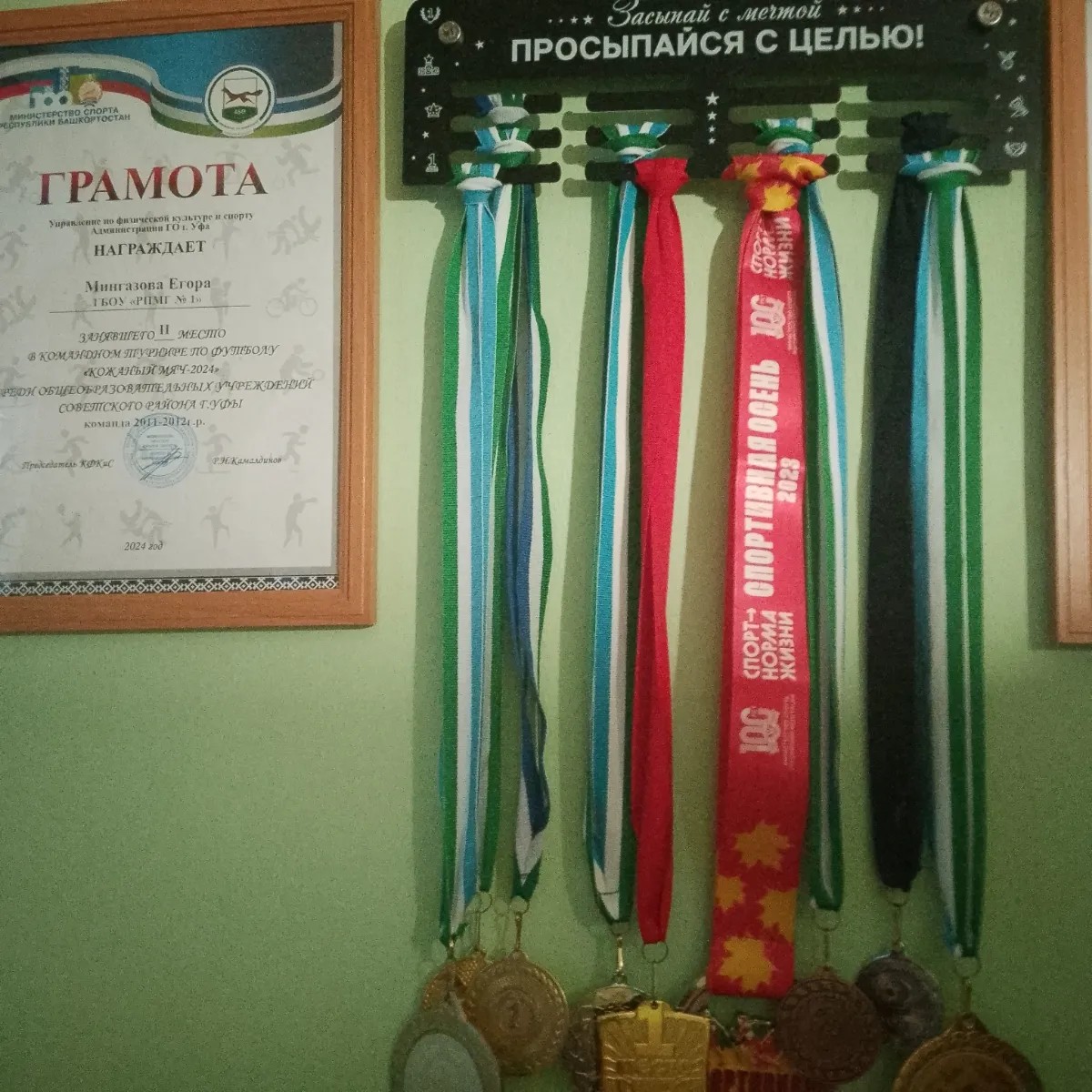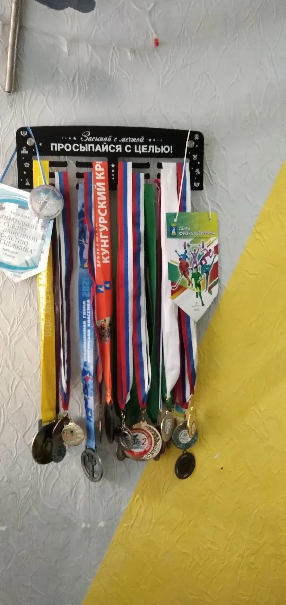 Эта небольшая, но очень крепкая и вместительная медальница порадует любого чемпиона! Изготовлена из стали толщиной 1,2 мм и выдерживает весомую нагрузку, недостижимую для спортивных медальниц из других материалов. Держатель для медалей имеет следующие размеры: ширина - 30,5 см, высота - 10 см. Вы сможете с легкостью разместить порядка 30-40 медалей на стандартных лентах.Покрытие держателя для медалей – порошковая окраска, это промышленный способ окраски, который позволяет создать равномерное, эстетичное и безопасное покрытие на металле по всей площади изделия. Цветная ультрафиолетовая печать – яркое, безопасное и стойкое к смыванию нанесение, которое будет радовать вас первозданными цветами долгие годы.В комплект входит монтажный набор: дюбеля, саморезы и фирменные дистанционные держатели, позволяющие создать отрыв от стены, для удобства размещения ваших медалей. Докупать ничего не придётся – всё уже продумано для вас! Поставляется медальница в крафтовой коробке, защищающей содержимое от повреждений при транспортировке.Данная модель подойдёт любому спортсмену с достаточным количеством трофеев в следующих видах спорта: футбол, хоккей, легкая атлетика марафон триатлон бег ходьба, тяжелая атлетика, пауэрлифтинг художественная и спортивная гимнастика бокс карате кикбоксинг баскетбол теннис волейбол ММА велоспорт, плавание стрельба.