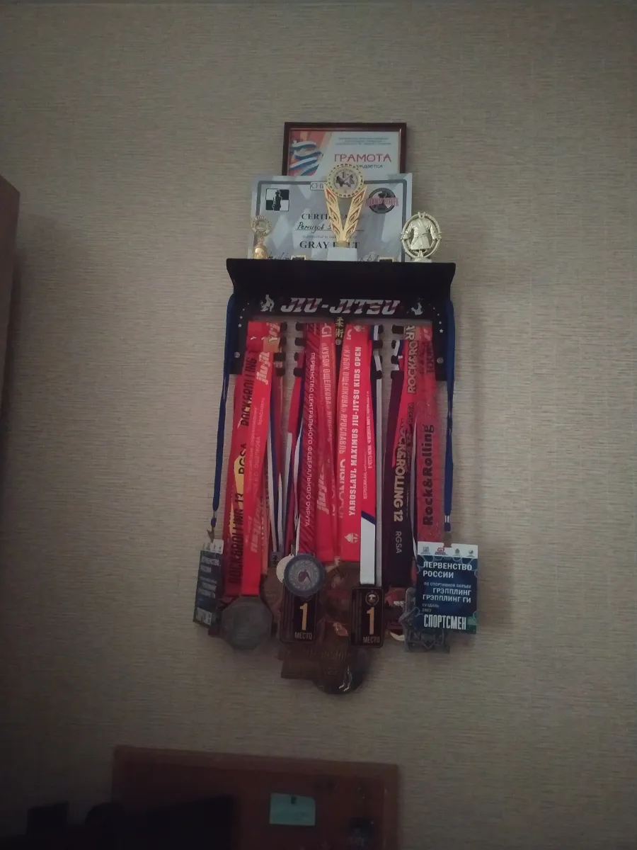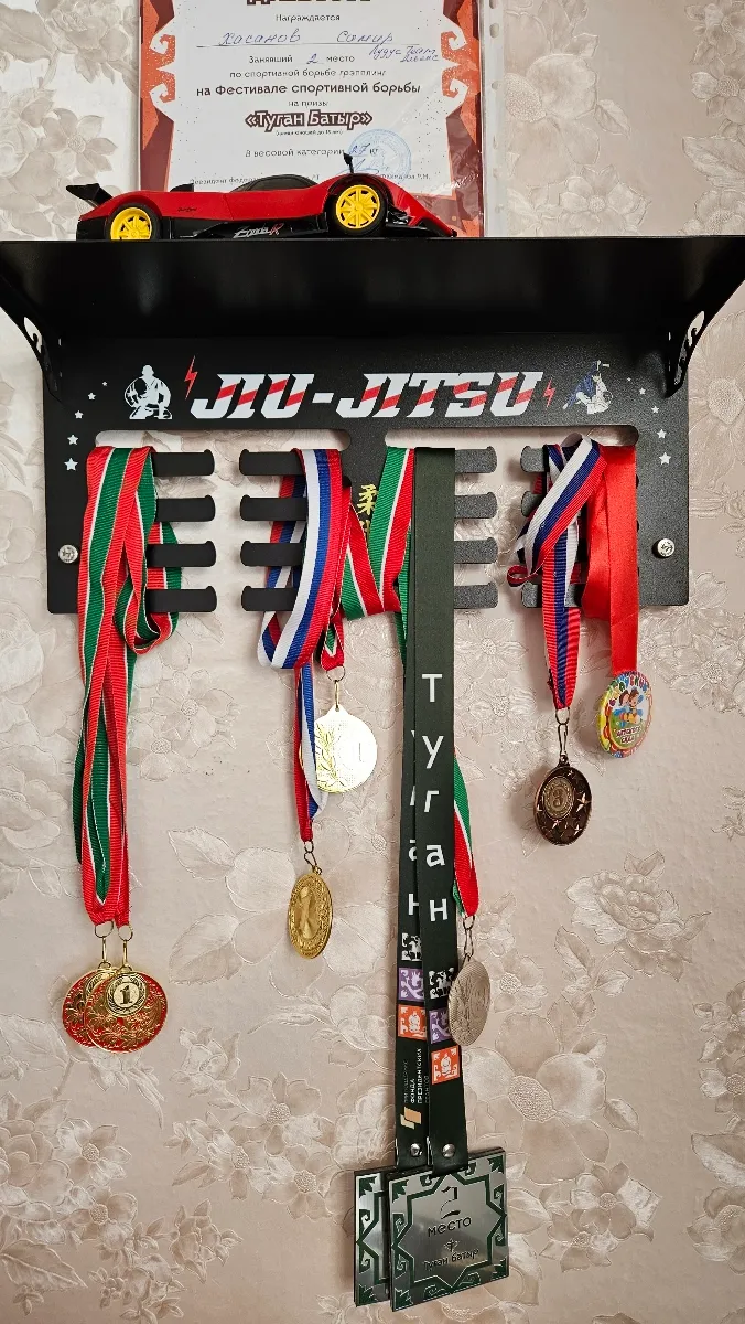 На медальнице с полкой для кубков можно разместить медали, кубки и другие награды категории джиу-джитсу, борьба, дзюдо. .