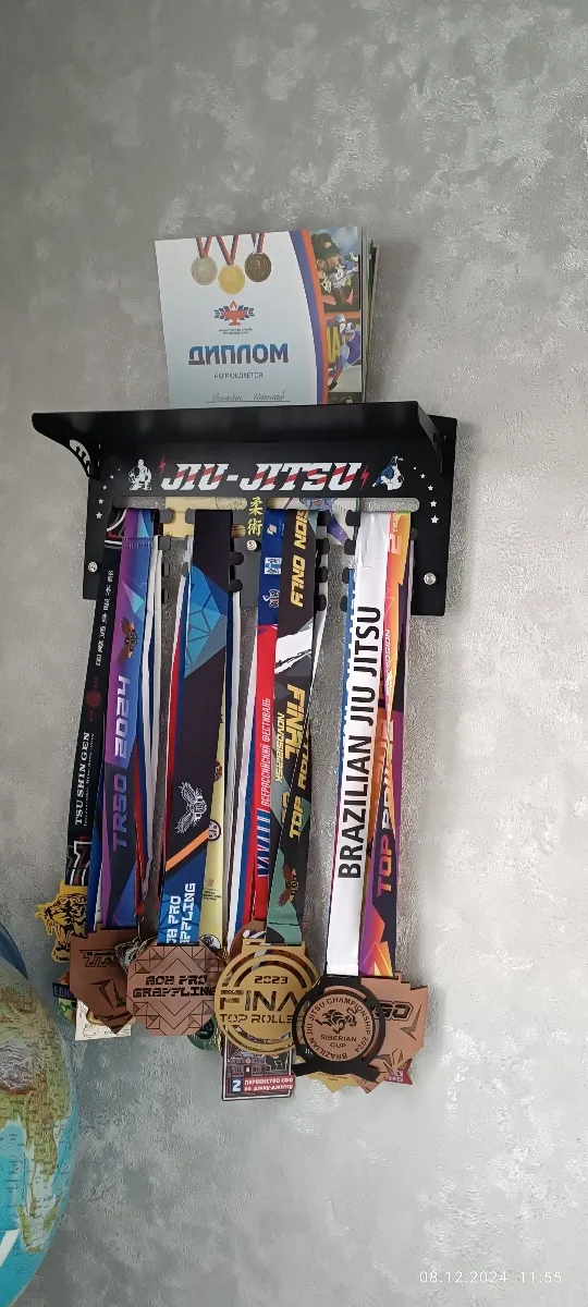 Медальница с полкой Лайт "Джиу-Джитсу" от компании "На Победе" - это результат многолетней работы над совершенствованием систем хранения наград. Бескомпромиссное качество нашей продукции подтверждено тысячами отзывов наших довольных покупателей. Мы используем самый качественный металл, профессиональные металлические дистанционные держатели и стильную упаковку. Никаких дешевых картонок для упаковки, деревянных чопиков для отрыва от стены и других составляющих гаражных поделок! Мы ценим наших покупателей и предлагаем продукт, продуманный до мелочей нашими инженерами-конструкторами и дизайнерами для удобного, стильного и безопасного размещения завоёванных вами трофеев и изготовленный в промышленных условиях с соблюдением всех норм и требований к изделию. Наш оригинальный держатель для медалей обладает стильным дизайном, великолепно вписывается в любой интерьер и призван вдохновлять на новые победы и достижения на спортивном Олимпе! Данная модель позволяет гармонично разместить более 50-60 медалей на классических лентах. Полка выдерживает достаточное количество кубков и статуэток. Толщина металла 1.2 мм и отсутствие загиба у полки создаёт впечатление парящих кубков, сама полка не оттягивает на себя акцент, направляя всё внимание завоеванным наградам. С недавних пор наши инженеры добавили новый функционал – теперь дипломы и грамоты можно хранить между стеной и медальницей, удерживать бланки призваны дистанционные держатели: два сверху по бокам и один по центру в нижней части медальницы. На металлической медальнице очень удобно размещать магниты, привезённые на память с соревнований из других городов и стран. Слева и справа на полке есть технологические вырезы, на которых можно разместить вымпелы. Мы изготавливаем медальницы из металла в промышленных условиях и занимаемся этим уже более 16 лет! Покрытие медальницы - полимерная порошковая окраска, сохраняющая презентабельный вид весь срок эксплуатации и абсолютно безопасная для здоровья. Изображение нанесено при помощи ультрафиолетовой печати, оно не стирается и не выгорает со временем. Спортивная медальница от компании "На Победе" - желанный подарок для любого спортсмена - мужчины или женщины. Держатель для медалей станет великолепным подарком к любому празднику или мероприятию, будь то день рождения, юбилей, 8 марта, 23 февраля, новый год и рождество, а так же ценным подарком на спортивных мероприятиях. Оригинальные медальницы от компании "На Победе" поставляются в красивой коробке-чемодане с ручкой и не требуют дополнительной упаковки. Весь набор креплений и дистанционных держателей уже входит в комплектацию, докупать ничего не потребуется. Ваш чемпион будет доволен! Ширина медальницы - 40 см, высота - 20 см, глубина полки для кубков - 12 см, ширина полки для кубков – 38 см.