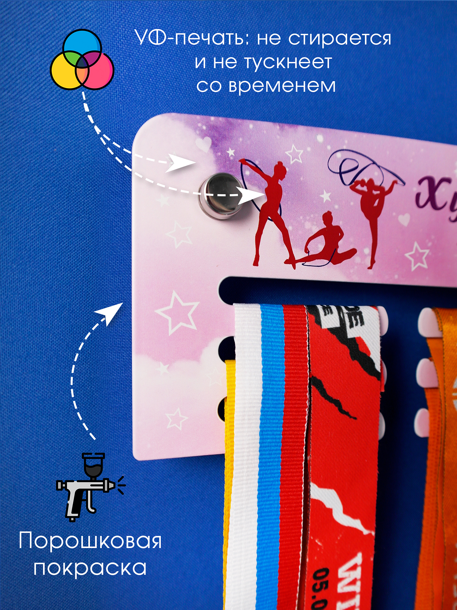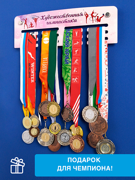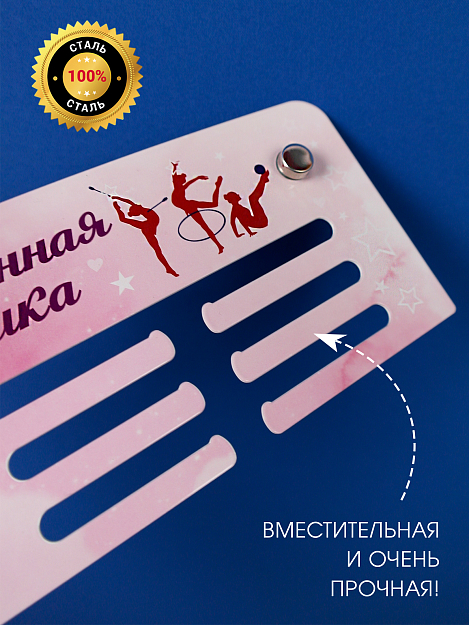 Эта небольшая, но очень крепкая и вместительная медальница порадует любого чемпиона! Изготовлена из стали толщиной 1,2 мм и выдерживает весомую нагрузку, недостижимую для спортивных медальниц из других материалов. Держатель для медалей имеет следующие размеры: ширина - 30,5 см, высота - 10 см. Вы сможете с легкостью разместить порядка 30-40 медалей на стандартных лентах.Покрытие держателя для медалей – порошковая окраска, это промышленный способ окраски, который позволяет создать равномерное, эстетичное и безопасное покрытие на металле по всей площади изделия. Цветная ультрафиолетовая печать – яркое, безопасное и стойкое к смыванию нанесение, которое будет радовать вас первозданными цветами долгие годы.В комплект входит монтажный набор: дюбеля, саморезы и фирменные дистанционные держатели, позволяющие создать отрыв от стены, для удобства размещения ваших медалей. Докупать ничего не придётся – всё уже продумано для вас! Поставляется медальница в крафтовой коробке, защищающей содержимое от повреждений при транспортировке.Данная модель подойдёт любому спортсмену с достаточным количеством трофеев в следующих видах спорта: футбол, хоккей, легкая атлетика марафон триатлон бег ходьба, тяжелая атлетика, пауэрлифтинг художественная и спортивная гимнастика бокс карате кикбоксинг баскетбол теннис волейбол ММА велоспорт, плавание стрельба.