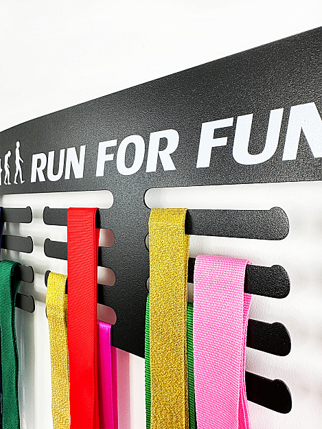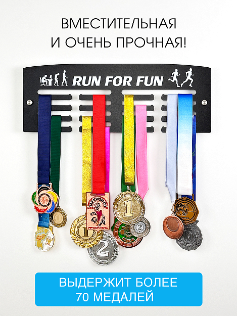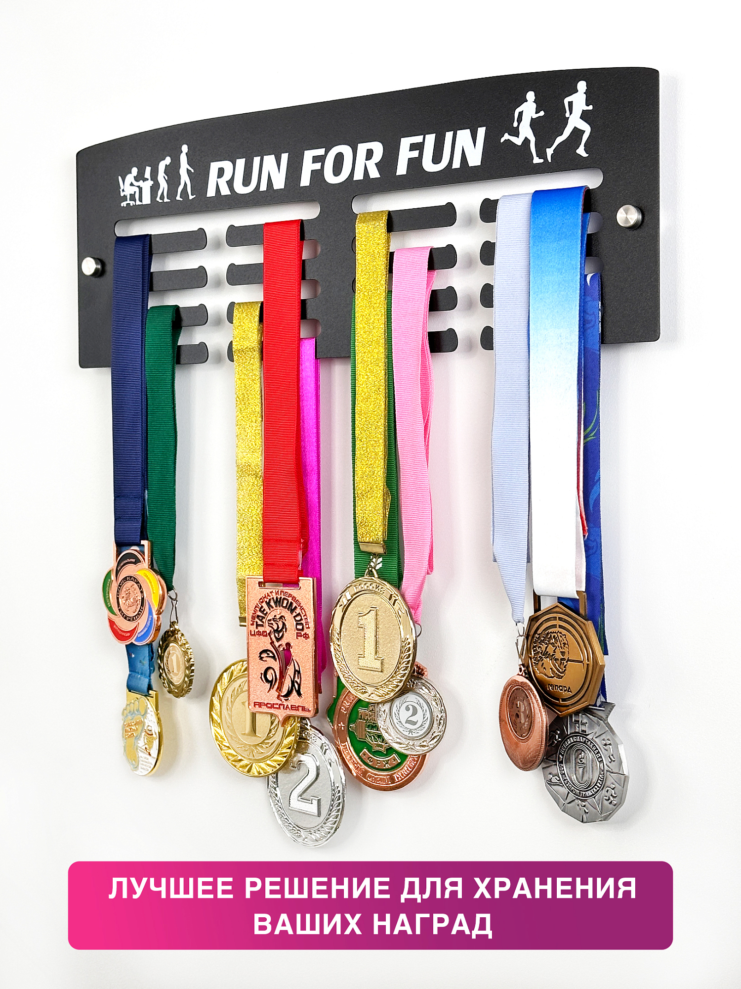Эта очень крепкая и вместительная медальница порадует любого чемпиона! Изготовлена из стали толщиной 1,2 мм и выдерживает весомую нагрузку, недостижимую для спортивных медальниц из других материалов. Держатель для медалей имеет следующие размеры: ширина - 40 см, высота - 14,5 см. Вы сможете с легкостью разместит до 90 медалей на стандартных лентах. Покрытие держателя для медалей – порошковая окраска, это промышленный способ окраски, который позволяет создать равномерное, эстетичное и безопасное покрытие на металле по всей площади изделия. Цветная ультрафиолетовая печать – яркое, безопасное и стойкое к смыванию нанесение, которое будет радовать вас первозданными цветами долгие годы. В комплект входит монтажный набор: дюбеля, саморезы и фирменные дистанционные держатели, позволяющие создать отрыв от стены, для удобства размещения ваших медалей. Докупать ничего не придётся – всё уже продумано для вас! Поставляется медальница в крафтовой коробке, защищающей содержимое от повреждений при транспортировке. На медальнице медали и награды категории футбол хоккей легкая атлетика марафон триатлон бег ходьба тяжелая атлетика пауэрлифтинг художественная и спортивная гимнастика бокс карате кикбоксинг баскетбол теннис волейбол ММА велоспорт плавание стрельба.