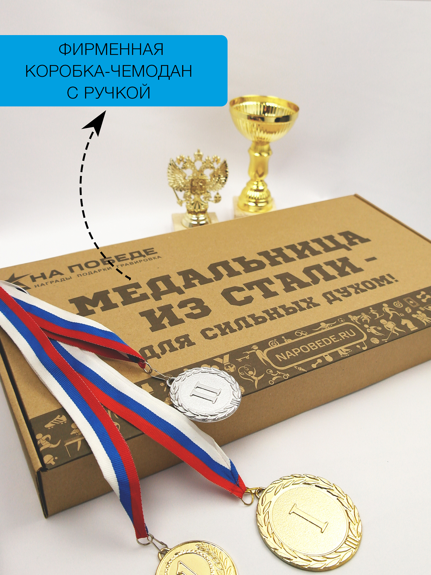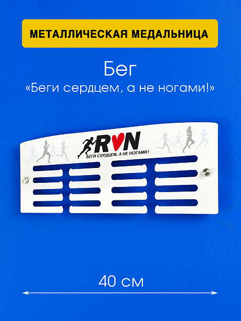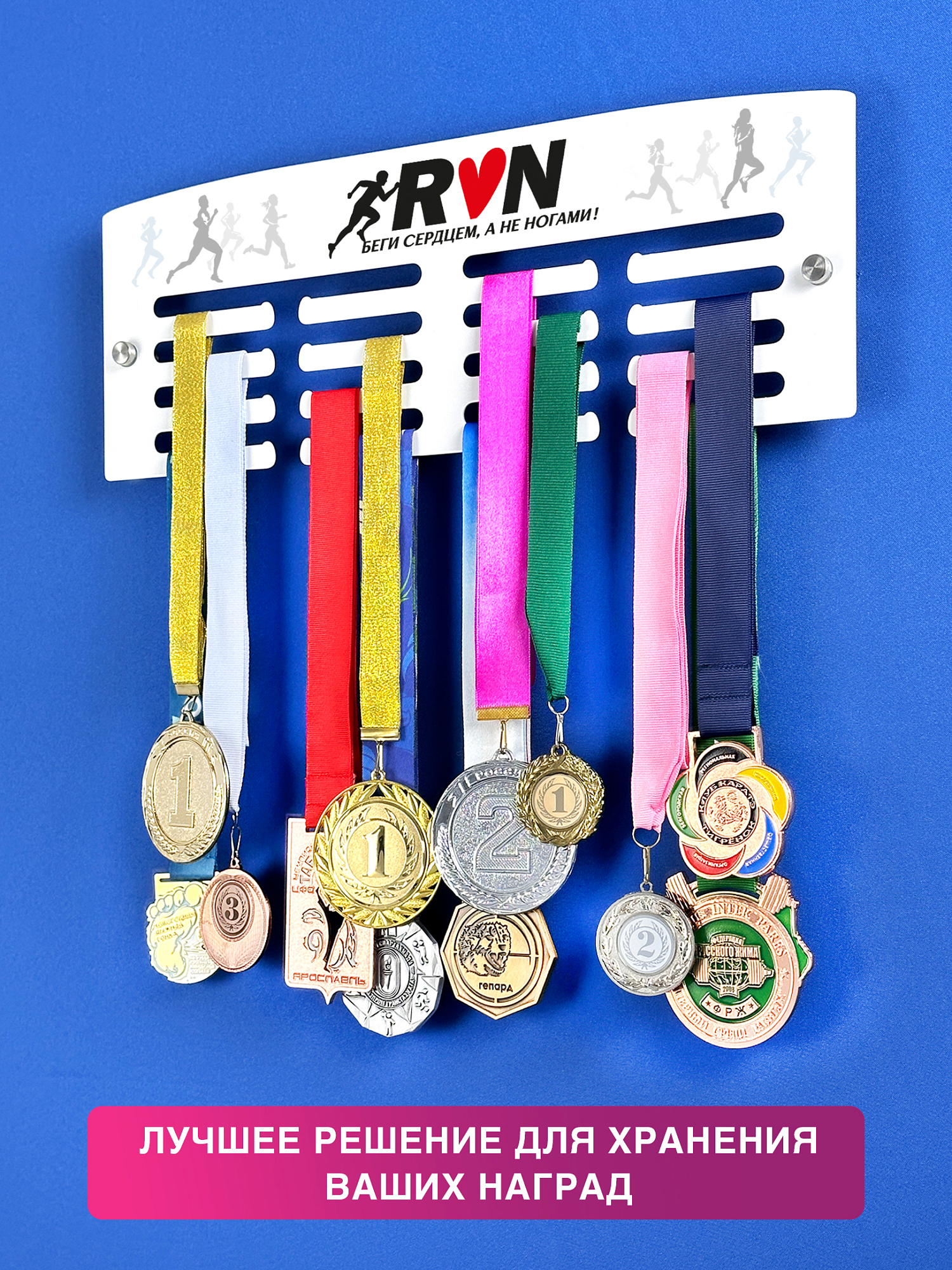 Эта очень крепкая и вместительная медальница порадует любого чемпиона! Изготовлена из стали толщиной 1,2 мм и выдерживает весомую нагрузку, недостижимую для спортивных медальниц из других материалов. Держатель для медалей имеет следующие размеры: ширина - 40 см, высота - 14,5 см. Вы сможете с легкостью разместит до 90 медалей на стандартных лентах. Покрытие держателя для медалей – порошковая окраска, это промышленный способ окраски, который позволяет создать равномерное, эстетичное и безопасное покрытие на металле по всей площади изделия. Цветная ультрафиолетовая печать – яркое, безопасное и стойкое к смыванию нанесение, которое будет радовать вас первозданными цветами долгие годы. В комплект входит монтажный набор: дюбеля, саморезы и фирменные дистанционные держатели, позволяющие создать отрыв от стены, для удобства размещения ваших медалей. Докупать ничего не придётся – всё уже продумано для вас! Поставляется медальница в крафтовой коробке, защищающей содержимое от повреждений при транспортировке. На медальнице медали и награды категории футбол хоккей легкая атлетика марафон триатлон бег ходьба тяжелая атлетика пауэрлифтинг художественная и спортивная гимнастика бокс карате кикбоксинг баскетбол теннис волейбол ММА велоспорт плавание стрельба.
