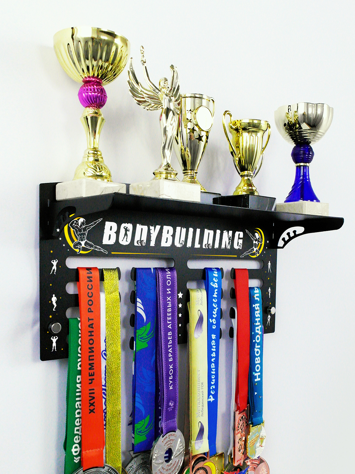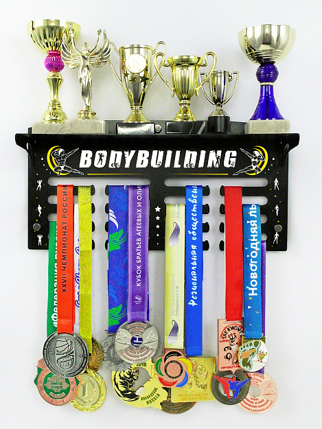 На медальнице с полкой для кубков можно разместить медали, кубки и другие награды категории бодибилдинг.