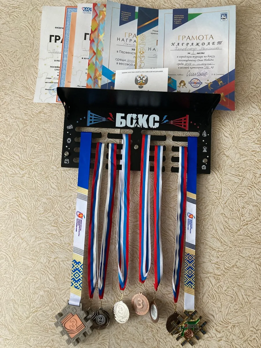 На медальнице с полкой для кубков можно разместить медали, кубки и другие награды категории бокс.