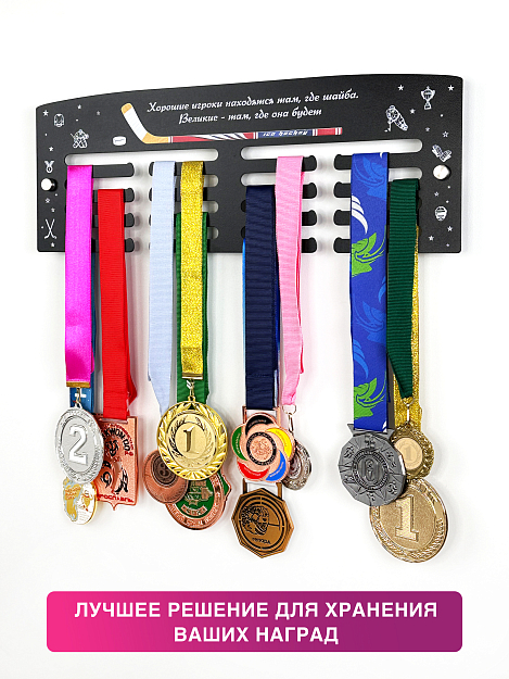 Эта очень крепкая и вместительная медальница порадует любого чемпиона! Изготовлена из стали толщиной 1,2 мм и выдерживает весомую нагрузку, недостижимую для спортивных медальниц из других материалов. Держатель для медалей имеет следующие размеры: ширина - 40 см, высота - 14,5 см. Вы сможете с легкостью разместит до 90 медалей на стандартных лентах. Покрытие держателя для медалей – порошковая окраска, это промышленный способ окраски, который позволяет создать равномерное, эстетичное и безопасное покрытие на металле по всей площади изделия. Цветная ультрафиолетовая печать – яркое, безопасное и стойкое к смыванию нанесение, которое будет радовать вас первозданными цветами долгие годы. В комплект входит монтажный набор: дюбеля, саморезы и фирменные дистанционные держатели, позволяющие создать отрыв от стены, для удобства размещения ваших медалей. Докупать ничего не придётся – всё уже продумано для вас! Поставляется медальница в крафтовой коробке, защищающей содержимое от повреждений при транспортировке. На медальнице медали и награды категории футбол хоккей легкая атлетика марафон триатлон бег ходьба тяжелая атлетика пауэрлифтинг художественная и спортивная гимнастика бокс карате кикбоксинг баскетбол теннис волейбол ММА велоспорт плавание стрельба.