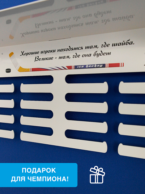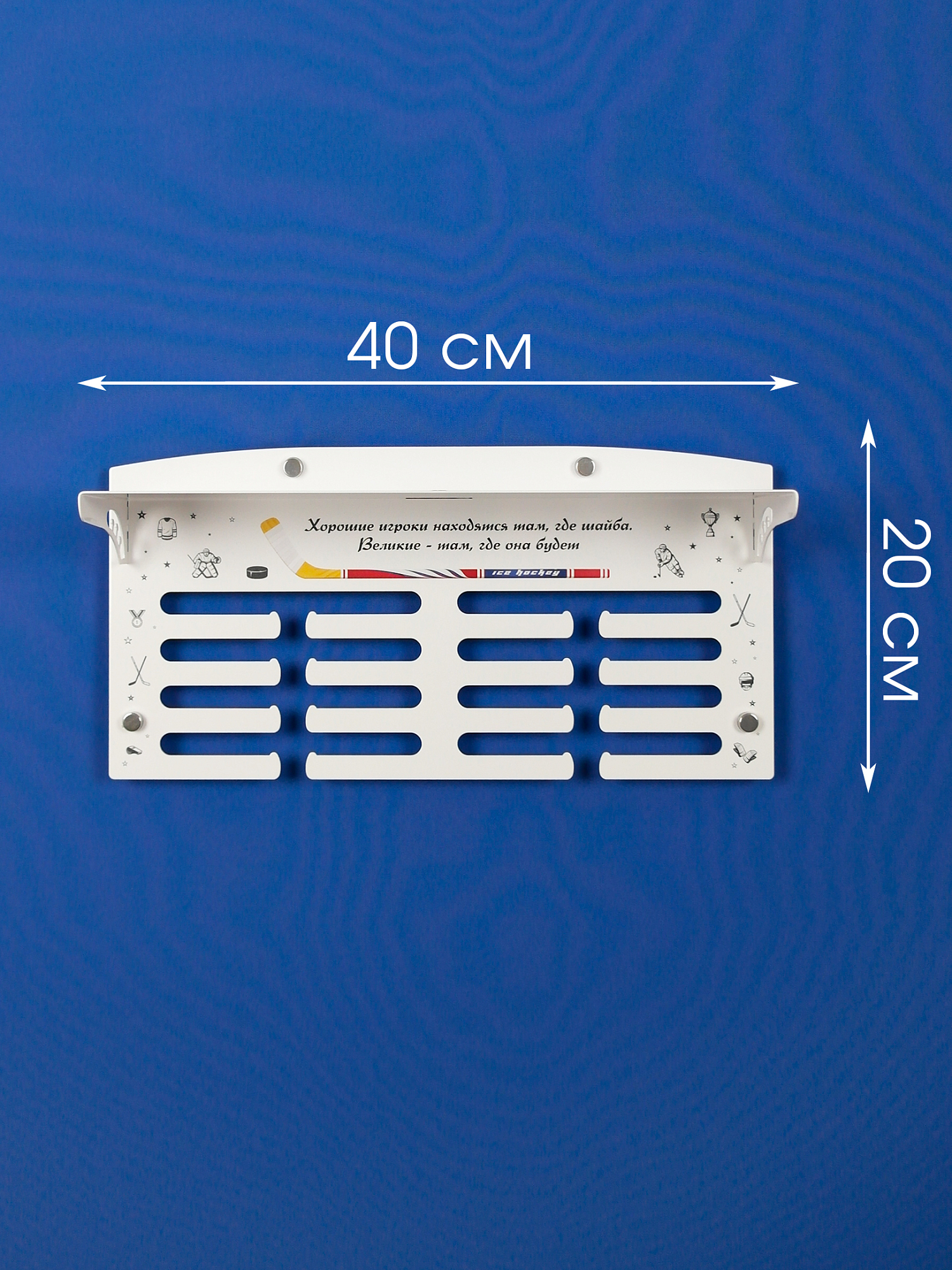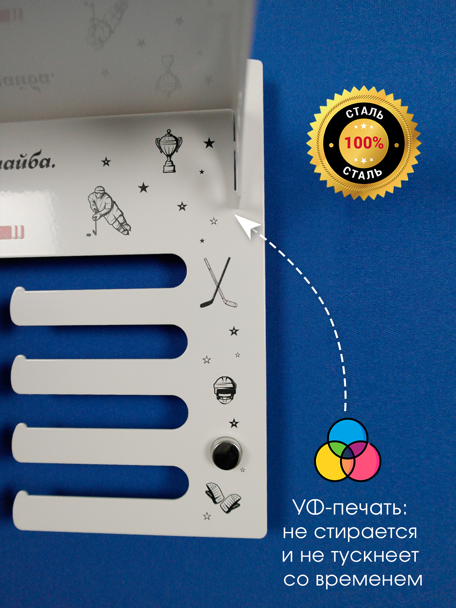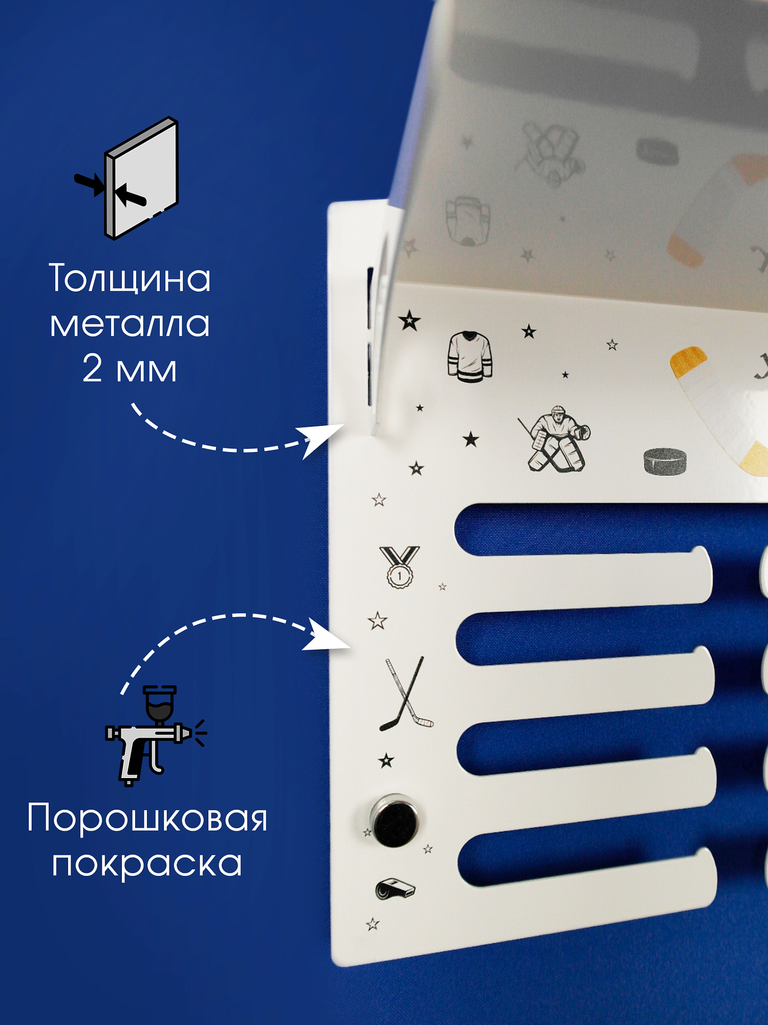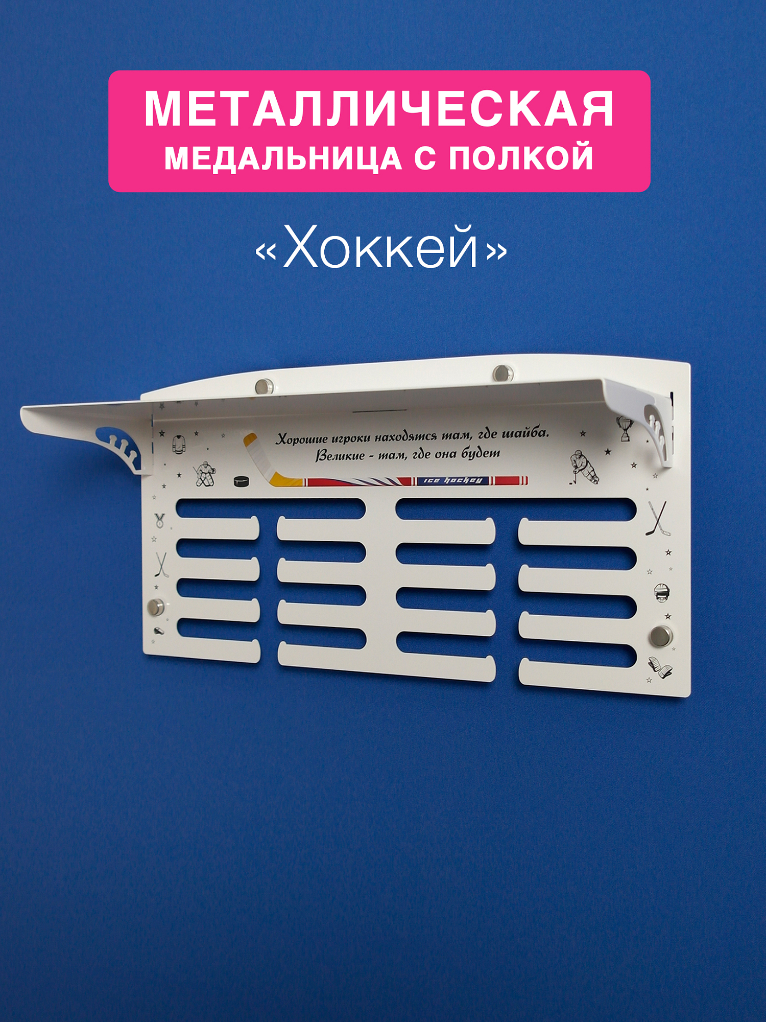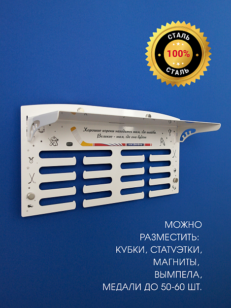 Медальница с полкой Лайт "Хоккей" от компании "На Победе" - это результат многолетней работы над совершенствованием систем хранения наград. Бескомпромиссное качество нашей продукции подтверждено тысячами отзывов наших довольных покупателей. Мы используем самый качественный металл, профессиональные металлические дистанционные держатели и стильную упаковку. Никаких дешевых картонок для упаковки, деревянных чопиков для отрыва от стены и других составляющих гаражных поделок! Мы ценим наших покупателей и предлагаем продукт, продуманный до мелочей нашими инженерами-конструкторами и дизайнерами для удобного, стильного и безопасного размещения завоёванных вами трофеев и изготовленный в промышленных условиях с соблюдением всех норм и требований к изделию. Наш оригинальный держатель для медалей обладает стильным дизайном, великолепно вписывается в любой интерьер и призван вдохновлять на новые победы и достижения на спортивном Олимпе! Данная модель позволяет гармонично разместить более 50-60 медалей на классических лентах. Полка выдерживает достаточное количество кубков и статуэток. Толщина металла 1.2 мм и отсутствие загиба у полки создаёт впечатление парящих кубков, сама полка не оттягивает на себя акцент, направляя всё внимание завоеванным наградам. С недавних пор наши инженеры добавили новый функционал – теперь дипломы и грамоты можно хранить между стеной и медальницей, удерживать бланки призваны дистанционные держатели: два сверху по бокам и один по центру в нижней части медальницы. На металлической медальнице очень удобно размещать магниты, привезённые на память с соревнований из других городов и стран. Слева и справа на полке есть технологические вырезы, на которых можно разместить вымпелы. Мы изготавливаем медальницы из металла в промышленных условиях и занимаемся этим уже более 16 лет! Покрытие медальницы - полимерная порошковая окраска, сохраняющая презентабельный вид весь срок эксплуатации и абсолютно безопасная для здоровья. Изображение нанесено при помощи ультрафиолетовой печати, оно не стирается и не выгорает со временем. Спортивная медальница от компании "На Победе" - желанный подарок для любого спортсмена - мужчины или женщины. Держатель для медалей станет великолепным подарком к любому празднику или мероприятию, будь то день рождения, юбилей, 8 марта, 23 февраля, новый год и рождество, а так же ценным подарком на спортивных мероприятиях. Оригинальные медальницы от компании "На Победе" поставляются в красивой коробке-чемодане с ручкой и не требуют дополнительной упаковки. Весь набор креплений и дистанционных держателей уже входит в комплектацию, докупать ничего не потребуется. Ваш чемпион будет доволен! Ширина медальницы - 40 см, высота - 20 см, глубина полки для кубков - 12 см, ширина полки для кубков – 38 см.
