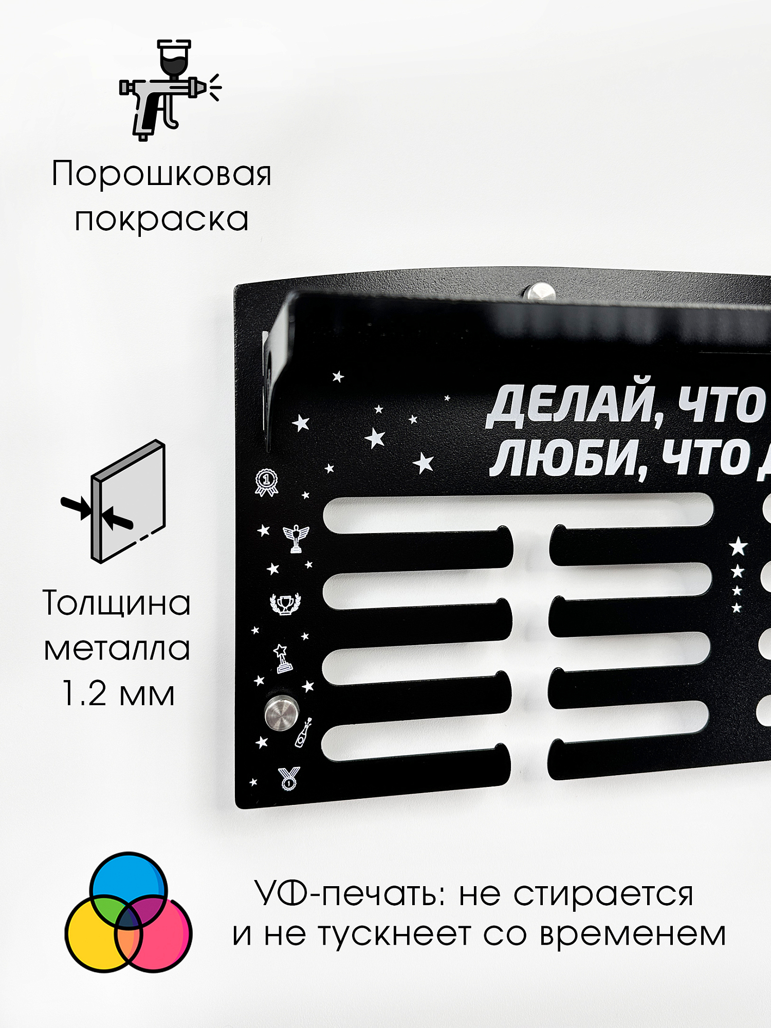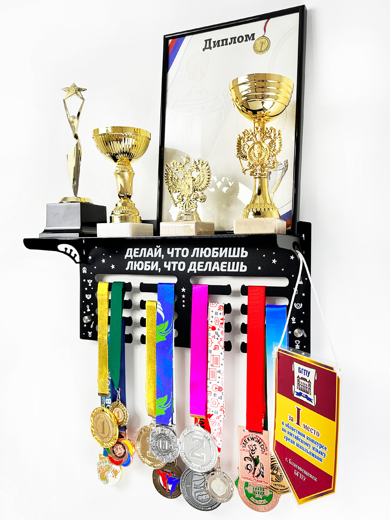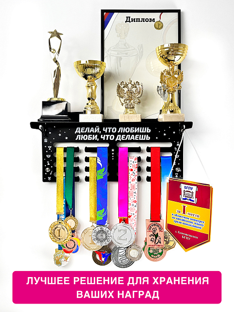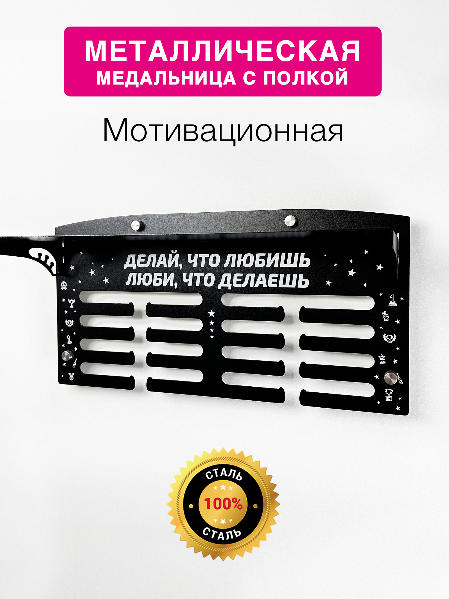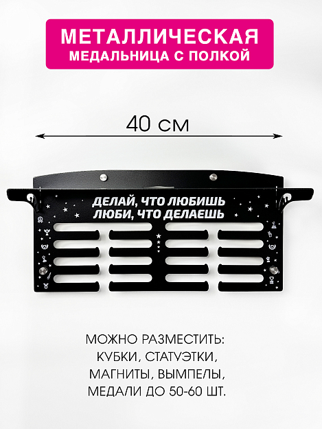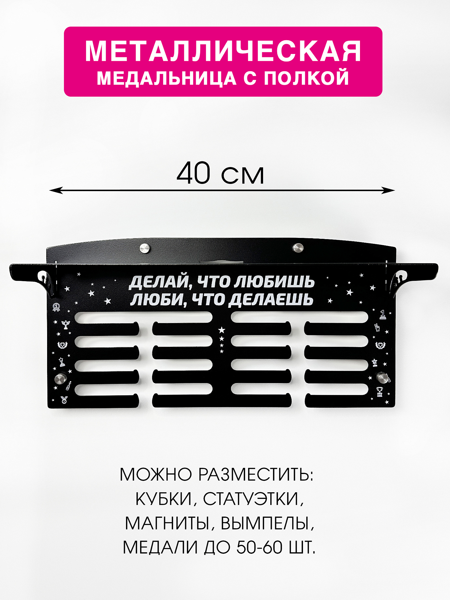 Медальница с полкой Лайт "Делай что любишь" от компании "На Победе" - это результат многолетней работы над совершенствованием систем хранения наград. Бескомпромиссное качество нашей продукции подтверждено тысячами отзывов наших довольных покупателей. Мы используем самый качественный металл, профессиональные металлические дистанционные держатели и стильную упаковку. Никаких дешевых картонок для упаковки, деревянных чопиков для отрыва от стены и других составляющих гаражных поделок! Мы ценим наших покупателей и предлагаем продукт, продуманный до мелочей нашими инженерами-конструкторами и дизайнерами для удобного, стильного и безопасного размещения завоёванных вами трофеев и изготовленный в промышленных условиях с соблюдением всех норм и требований к изделию. Наш оригинальный держатель для медалей обладает стильным дизайном, великолепно вписывается в любой интерьер и призван вдохновлять на новые победы и достижения на спортивном Олимпе! Данная модель позволяет гармонично разместить более 50-60 медалей на классических лентах. Полка выдерживает достаточное количество кубков и статуэток. Толщина металла 1.2 мм и отсутствие загиба у полки создаёт впечатление парящих кубков, сама полка не оттягивает на себя акцент, направляя всё внимание завоеванным наградам. С недавних пор наши инженеры добавили новый функционал – теперь дипломы и грамоты можно хранить между стеной и медальницей, удерживать бланки призваны дистанционные держатели: два сверху по бокам и один по центру в нижней части медальницы. На металлической медальнице очень удобно размещать магниты, привезённые на память с соревнований из других городов и стран. Слева и справа на полке есть технологические вырезы, на которых можно разместить вымпелы. Мы изготавливаем медальницы из металла в промышленных условиях и занимаемся этим уже более 16 лет! Покрытие медальницы - полимерная порошковая окраска, сохраняющая презентабельный вид весь срок эксплуатации и абсолютно безопасная для здоровья. Спортивная медальница от компании "На Победе" - желанный подарок для любого спортсмена - мужчины или женщины. Держатель для медалей станет великолепным подарком к любому празднику или мероприятию, будь то день рождения, юбилей, 8 марта, 23 февраля, новый год и рождество, а так же ценным подарком на спортивных мероприятиях. Оригинальные медальницы от компании "На Победе" поставляются в красивой коробке-чемодане с ручкой и не требуют дополнительной упаковки. Весь набор креплений и дистанционных держателей уже входит в комплектацию, докупать ничего не потребуется. Ваш чемпион будет доволен! Ширина медальницы - 40 см, высота - 20 см, глубина полки для кубков - 12 см, ширина полки для кубков – 38 см.