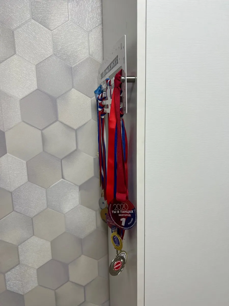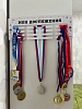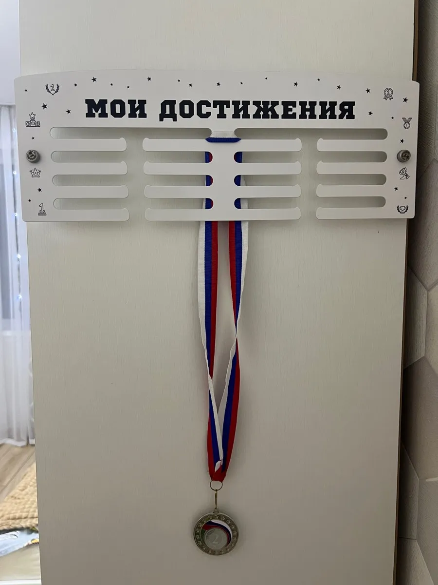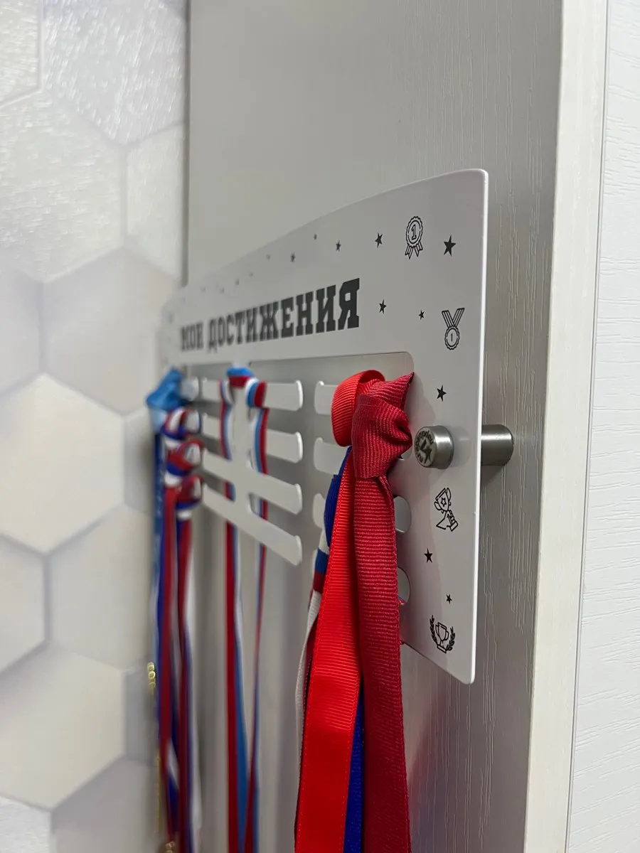 Эта очень крепкая и вместительная медальница порадует любого чемпиона! Изготовлена из стали толщиной 1,2 мм и выдерживает весомую нагрузку, недостижимую для спортивных медальниц из других материалов. Держатель для медалей имеет следующие размеры: ширина - 40 см, высота - 14,5 см. Вы сможете с легкостью разместит до 90 медалей на стандартных лентах. Покрытие держателя для медалей – порошковая окраска, это промышленный способ окраски, который позволяет создать равномерное, эстетичное и безопасное покрытие на металле по всей площади изделия. Цветная ультрафиолетовая печать – яркое, безопасное и стойкое к смыванию нанесение, которое будет радовать вас первозданными цветами долгие годы. В комплект входит монтажный набор: дюбеля, саморезы и фирменные дистанционные держатели, позволяющие создать отрыв от стены, для удобства размещения ваших медалей. Докупать ничего не придётся – всё уже продумано для вас! Поставляется медальница в крафтовой коробке, защищающей содержимое от повреждений при транспортировке. На медальнице медали и награды категории футбол хоккей легкая атлетика марафон триатлон бег ходьба тяжелая атлетика пауэрлифтинг художественная и спортивная гимнастика бокс карате кикбоксинг баскетбол теннис волейбол ММА велоспорт плавание стрельба.