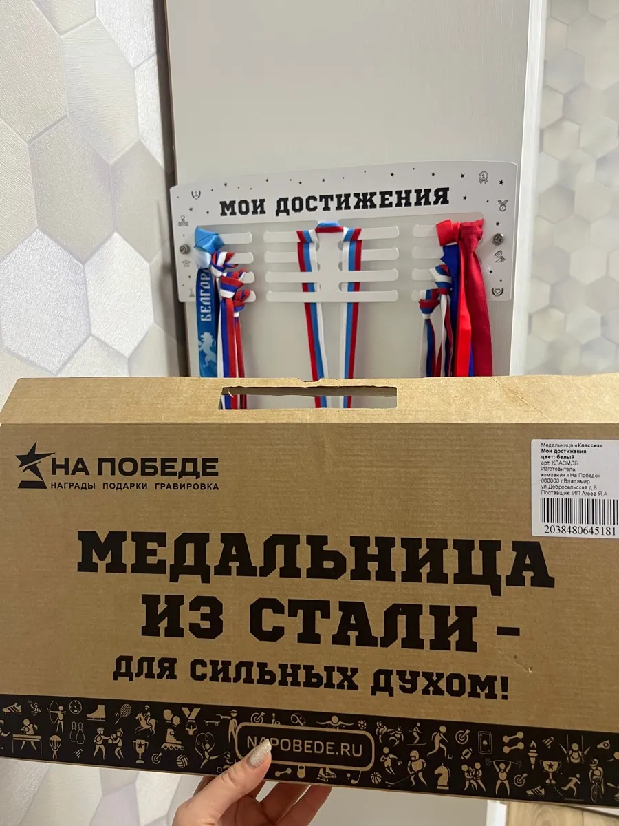 Качество медальницы отличное . Все упаковано хорошо, в красивых фирменных коробках. Внутри фирменный пакет и крепеж. Наконец навели порядок. Очень порадовал небольшой размер и вместительность медальницы ( мы не хотели портить стены и крепили к шкафу).
