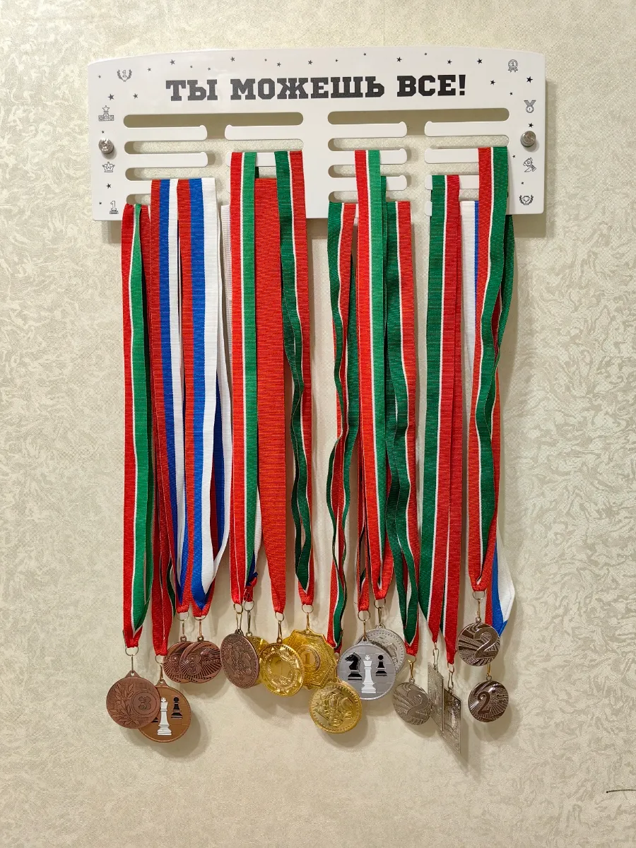 Эта очень крепкая и вместительная медальница порадует любого чемпиона! Изготовлена из стали толщиной 1,2 мм и выдерживает весомую нагрузку, недостижимую для спортивных медальниц из других материалов. Держатель для медалей имеет следующие размеры: ширина - 40 см, высота - 14,5 см. Вы сможете с легкостью разместит до 90 медалей на стандартных лентах. Покрытие держателя для медалей – порошковая окраска, это промышленный способ окраски, который позволяет создать равномерное, эстетичное и безопасное покрытие на металле по всей площади изделия. Цветная ультрафиолетовая печать – яркое, безопасное и стойкое к смыванию нанесение, которое будет радовать вас первозданными цветами долгие годы. В комплект входит монтажный набор: дюбеля, саморезы и фирменные дистанционные держатели, позволяющие создать отрыв от стены, для удобства размещения ваших медалей. Докупать ничего не придётся – всё уже продумано для вас! Поставляется медальница в крафтовой коробке, защищающей содержимое от повреждений при транспортировке. На медальнице медали и награды категории футбол хоккей легкая атлетика марафон триатлон бег ходьба тяжелая атлетика пауэрлифтинг художественная и спортивная гимнастика бокс карате кикбоксинг баскетбол теннис волейбол ММА велоспорт плавание стрельба.