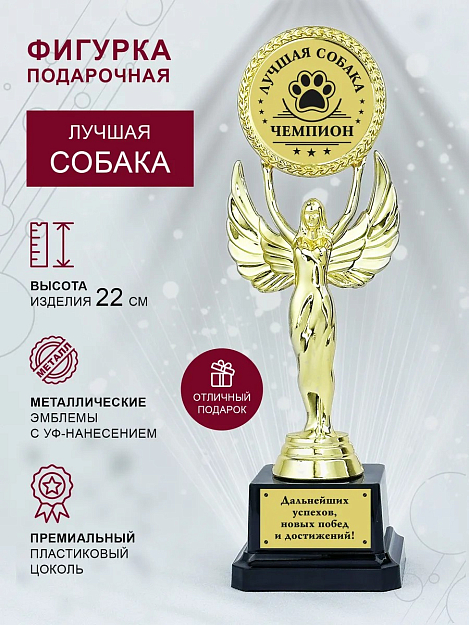 Стильная подарочная статуэтка "Лучшая собака. Чемпион" - отлично подойдёт для любой церемонии награждения и как подарок. Выставки собак, подарок питомцу, награда для кинолога. Фигурка изготавливается из пластика с гальваническим покрытием под "золото". Основание изготовлено из премиального пластика. В верхней части фигурки размещён эмблемоноситель диаметром 5см для монтажа вставки с гравировкой. Статуэтка отлично впишется в любой интерьер и будет радовать своим стильным видом. Вы однозначно можете быть уверены в том, что ваш подарок точно не останется незамеченным!
