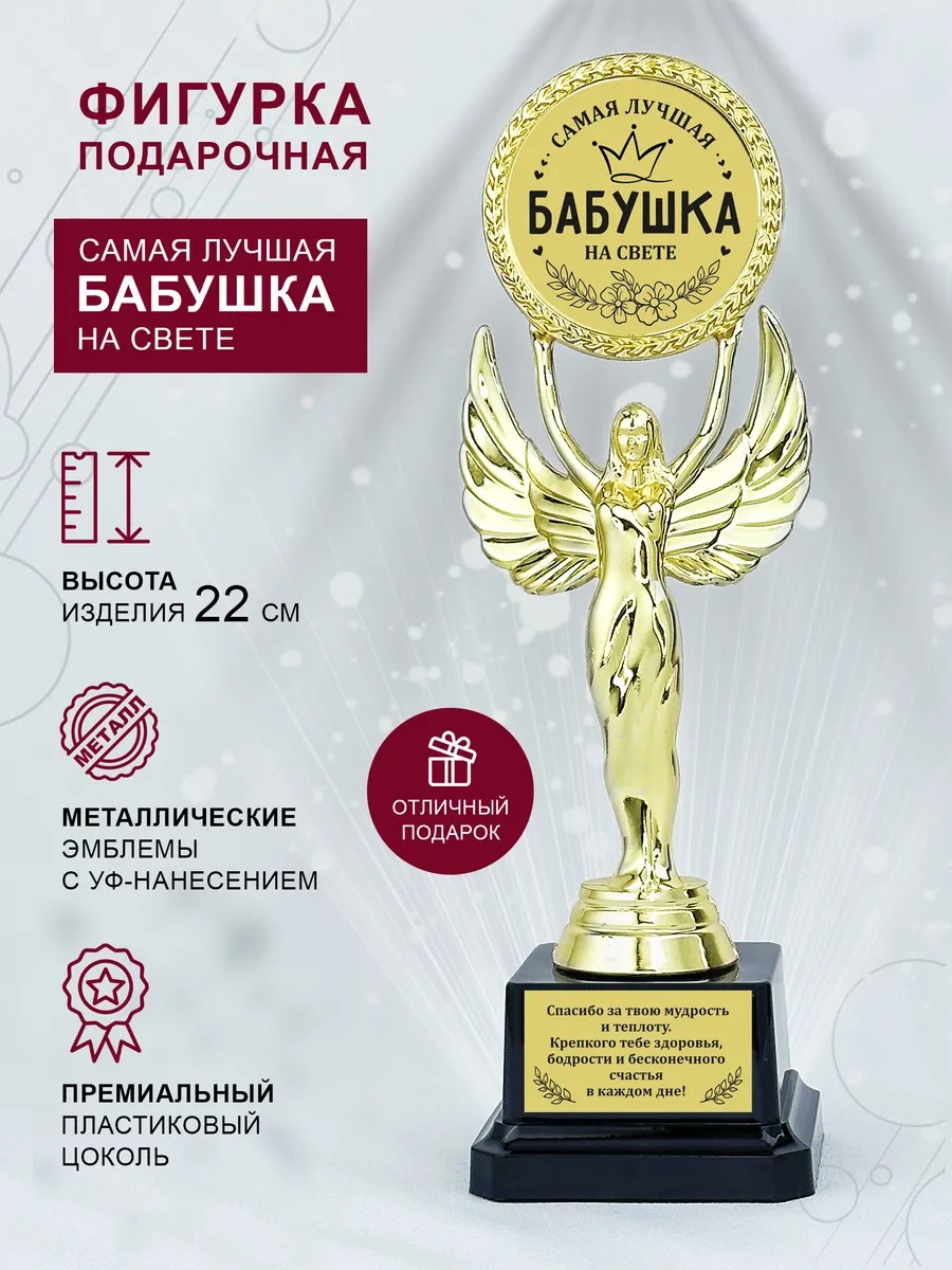 Основа статуэтки выполнена из прочного пластика с аккуратным покрытием под золото. Поверхность фигурки ровная, без шероховатостей, а постамент устойчивый и не скользит. Надпись читается четко и смотрится аккуратно. Каждая статуэтка подарочная идет на подставке и надежно упакована. Размеры коробки подходят для дарения без дополнительных приготовлений.