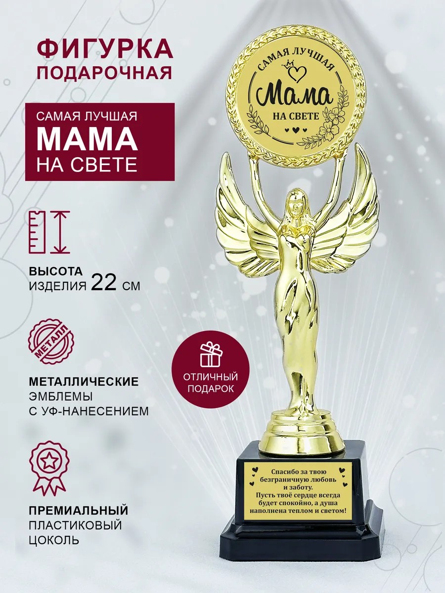 Основа статуэтки выполнена из прочного пластика с аккуратным покрытием под золото. Поверхность фигурки ровная, без шероховатостей, а постамент устойчивый и не скользит. Надпись читается четко и смотрится аккуратно. Каждая статуэтка подарочная идет на подставке и надежно упакована. Размеры коробки подходят для дарения без дополнительных приготовлений.
