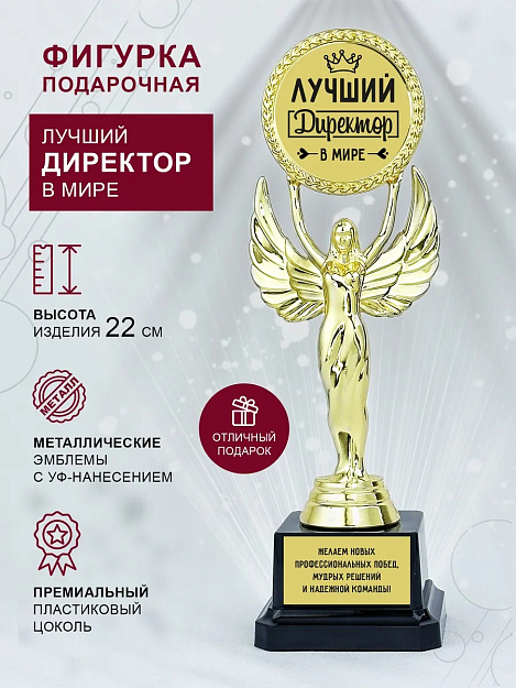 Стильная подарочная статуэтка "Лучший директор в мире" - отличный подарок директору за его труд. Фигурка изготавливается из пластика с гальваническим покрытием под "золото". Основание изготовлено из премиального пластика. В верхней части фигурки размещён эмблемоноситель диаметром 5см для монтажа вставки с гравировкой. Статуэтка Ника - идеальный подарок на любой повод! Этот подарок порадует ваших друзей и близких в торжественный день. Подарок для мамы, подарок для папы, подарок для бабушки или дедушки, начальнику или коллеге, брату или сестре подойдет к любому торжеству: юбилей, годовщина, 8 марта, 23 февраля и другие праздники. Что делает эту статуэтку такой особенной?! Конечно же это её оригинальный дизайн! Статуэтка отлично впишется в любой интерьер и будет радовать своим стильным видом. Такой подарок однозначно оценит одариваемый и запомнит момент вручения на долгие годы. Вы однозначно можете быть уверены в том, что ваш подарок точно не останется незамеченным! Кроме того, эта статуэтка Ника - прекрасный способ показать свои чувства близким людям. Статуэтка Ника идеально подойдет для тещи, тестя, свата и снохи. Кубок подарочный будет прекрасным дополнением к подарку на свадьбу, годовщину или юбилей. Ваша любящие родители тоже оценят такой классный презент в день рождения, а ваша девушка или жена будет приятно удивлена, получив этот кубок как символ вашей любви и нежности. Для мужчины этот кубок будет отличной идеей для праздничного подарка. Подарок дяде, брату, другу, коллеге, мужчине на день рождения - все они будут рады такому сюрпризу. Подарок учителю, преподавателю - тоже отличный повод для вручения этой статуэтки!