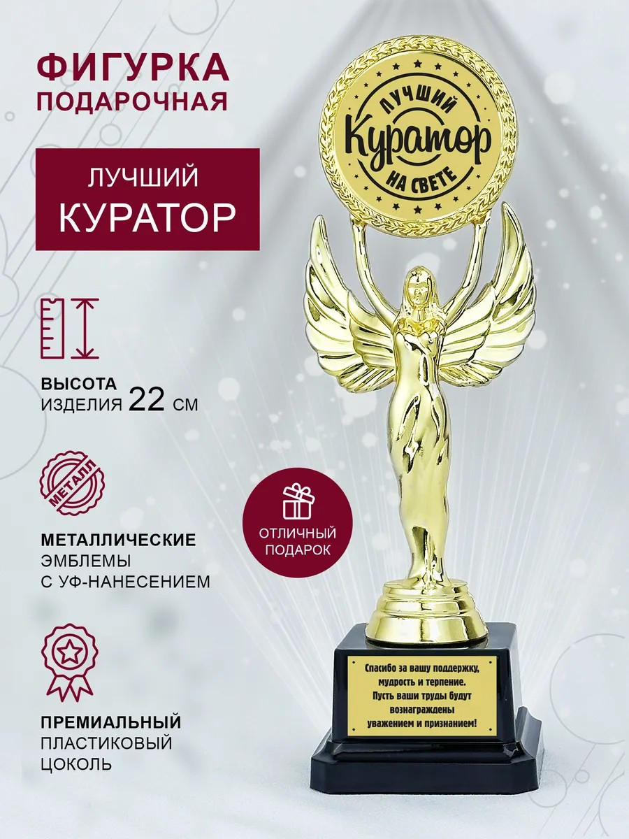 Стильная подарочная статуэтка "Лучший куратор" - отличный подарок преподавателю за его труд. Фигурка изготавливается из пластика с гальваническим покрытием под "золото". Основание изготовлено из премиального пластика. В верхней части фигурки размещён эмблемоноситель диаметром 5см для монтажа вставки с гравировкой. Статуэтка Ника - идеальный подарок на любой повод! Этот подарок порадует ваших друзей и близких в торжественный день. Подарок для мамы, подарок для папы, подарок для бабушки или дедушки, начальнику или коллеге, брату или сестре подойдет к любому торжеству: юбилей, годовщина, 8 марта, 23 февраля и другие праздники. Что делает эту статуэтку такой особенной?! Конечно же это её оригинальный дизайн! Статуэтка отлично впишется в любой интерьер и будет радовать своим стильным видом. Такой подарок однозначно оценит одариваемый и запомнит момент вручения на долгие годы. Вы однозначно можете быть уверены в том, что ваш подарок точно не останется незамеченным! Кроме того, эта статуэтка Ника - прекрасный способ показать свои чувства близким людям. Статуэтка Ника идеально подойдет для тещи, тестя, свата и снохи. Кубок подарочный будет прекрасным дополнением к подарку на свадьбу, годовщину или юбилей. Ваша любящие родители тоже оценят такой классный презент в день рождения, а ваша девушка или жена будет приятно удивлена, получив этот кубок как символ вашей любви и нежности. Для мужчины этот кубок будет отличной идеей для праздничного подарка. Подарок дяде, брату, другу, коллеге, мужчине на день рождения - все они будут рады такому сюрпризу. Подарок учителю, преподавателю - тоже отличный повод для вручения этой статуэтки!