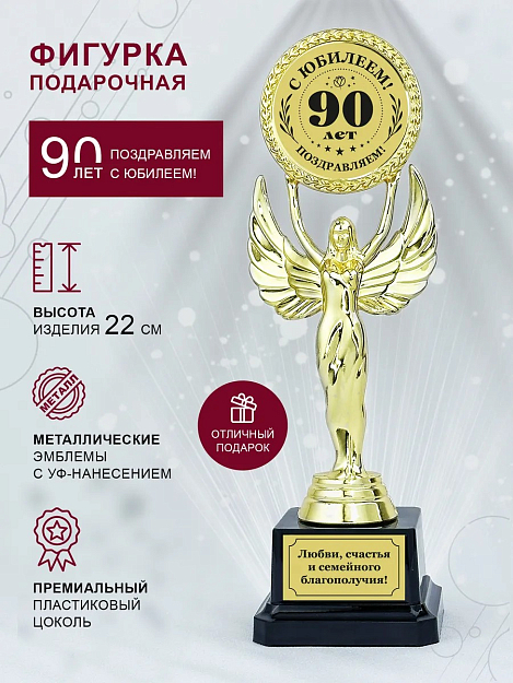 Основание статуэтки сделано из прочного черного пластика с глянцевым блеском. Основание обладает приятной тяжестью, предотвращающей случайное падение. В нижней части закреплена табличка с душевными словами. Шрифт надписи четкий и легко читаемый. Металлическая эмблема с УФ-печатью сохранит свою яркость долгие годы. Все детали тщательно отполированы, поверхность приятно гладкая и безупречно ровная.
