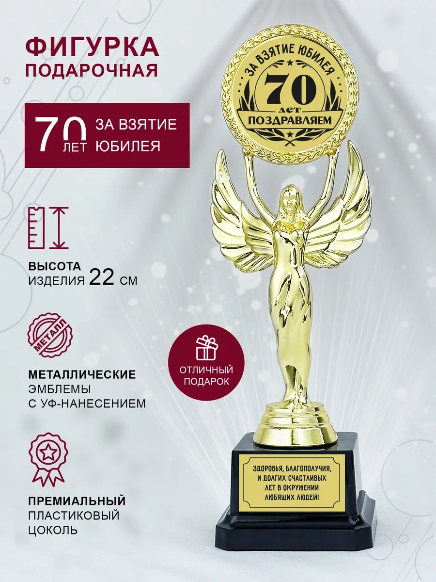 Статуэтка «Стелла За взятие Юбилея 70 лет». Золотистая статуэтка подарочная с расправленными крыльями выглядит торжественно, изящно и сдержанно. Узнаваемый и полный смысла образ Ники понятен каждому без слов. Именно такую богиню победы дарят, чтобы отметить важный рубеж, личный триумф или солидную дату. Ника устойчива, а строгий черный постамент подчеркивает благородный блеск главной фигурки. В руках статуэтки находится эмблема, куда гравируется возраст юбиляра, поэтому причина праздника читается мгновенно и не нуждается в дополнительных объяснениях.