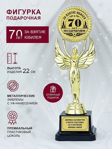 В этой статуэтке сразу чувствуется, что она создана для больших дат. Сама идея «За взятие юбилея» звучит уважительно, поэтому такой подарок подойдет абсолютно всем: коллеге, любимому родственнику, начальнику или старому другу. Статуэтка найдет свое место и в кабинете на столе, и на книжной полке в гостиной. Высота в 22 см — удачная середина, солидная, но не громоздкая. Когда берете статуэтку в руки, чувствуется приятная тяжесть и идеальный баланс.