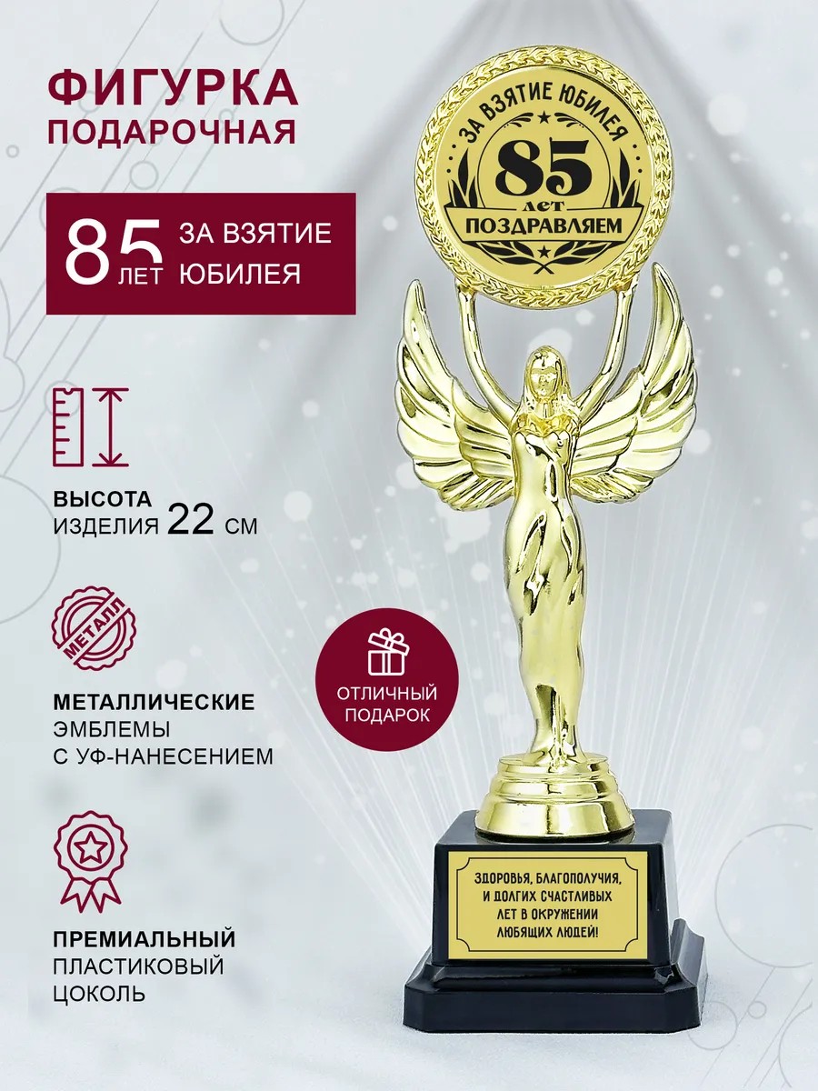 Статуэтка «Стелла За взятие Юбилея 85 лет». Золотистая статуэтка подарочная с расправленными крыльями выглядит торжественно, изящно и сдержанно. Узнаваемый и полный смысла образ Ники понятен каждому без слов. Именно такую богиню победы дарят, чтобы отметить важный рубеж, личный триумф или солидную дату. Ника устойчива, а строгий черный постамент подчеркивает благородный блеск главной фигурки. В руках статуэтки находится эмблема, куда гравируется возраст юбиляра, поэтому причина праздника читается мгновенно и не нуждается в дополнительных объяснениях.