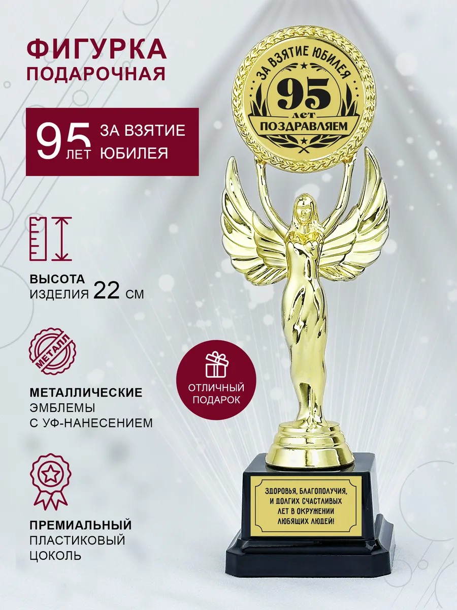 Статуэтка «Стелла За взятие Юбилея 95 лет». Золотистая статуэтка подарочная с расправленными крыльями выглядит торжественно, изящно и сдержанно. Узнаваемый и полный смысла образ Ники понятен каждому без слов. Именно такую богиню победы дарят, чтобы отметить важный рубеж, личный триумф или солидную дату. Ника устойчива, а строгий черный постамент подчеркивает благородный блеск главной фигурки. В руках статуэтки находится эмблема, куда гравируется возраст юбиляра, поэтому причина праздника читается мгновенно и не нуждается в дополнительных объяснениях.